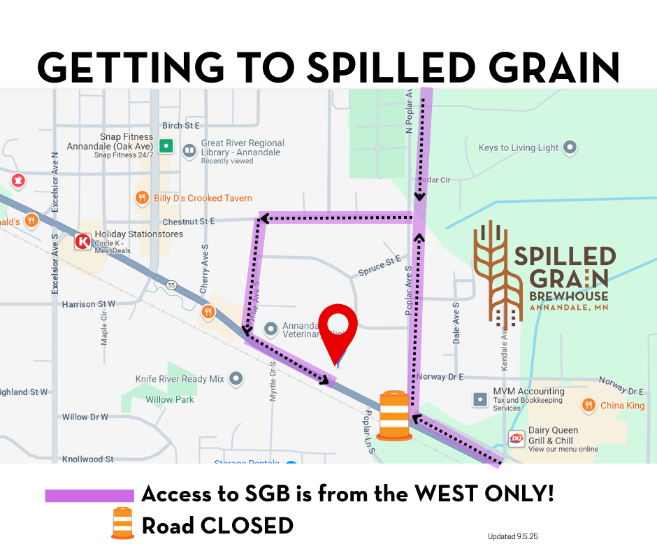 Hwy 55 is closed just to the east of our taproom. You can get to Annandale on hwy 55 from the east, you just have to add in some side streets around (Poplar Ave S to Chestnut St E to Myrtle Ave S to hwy55). You can also use this route from the north on the detour.